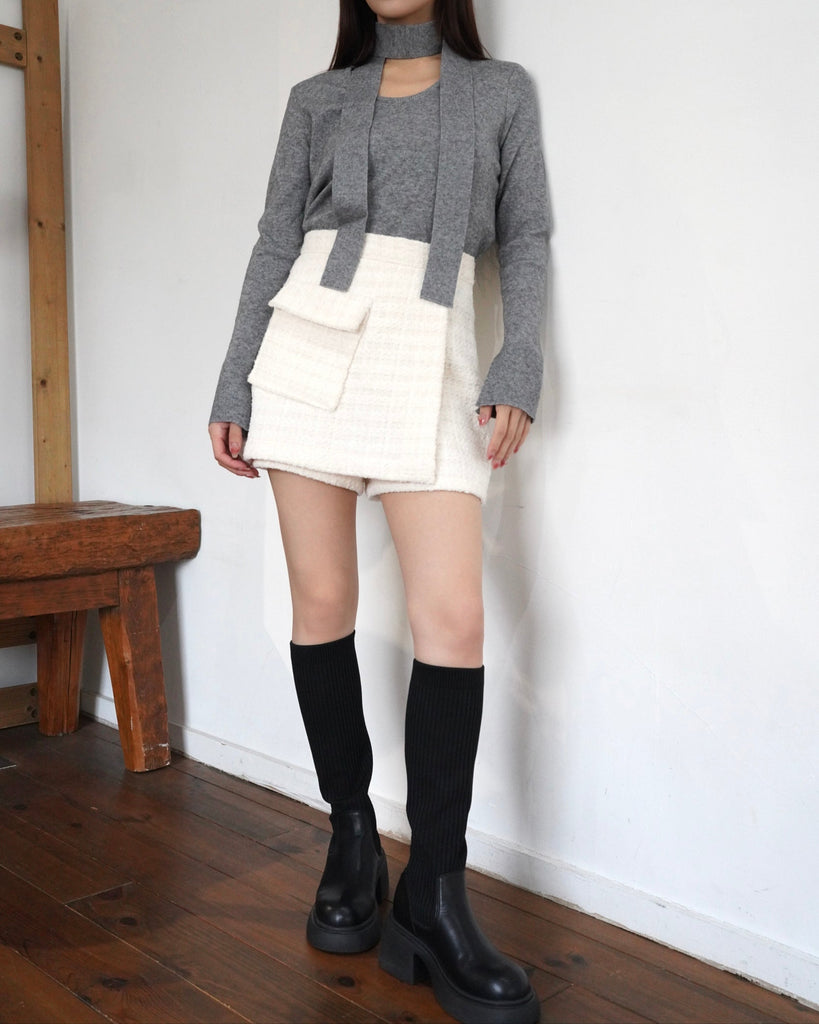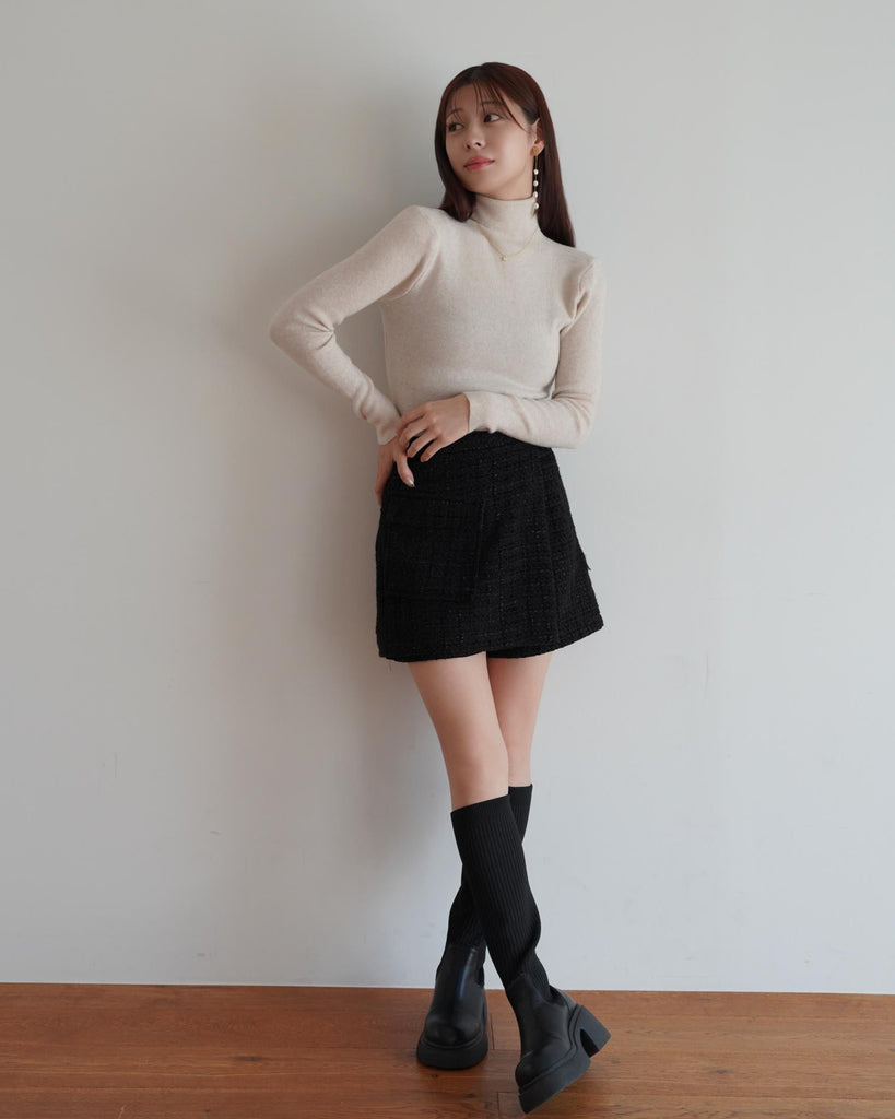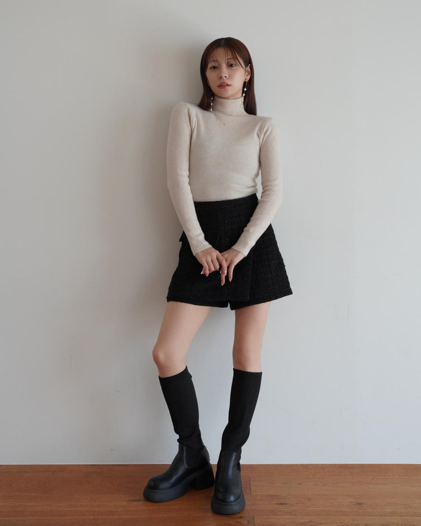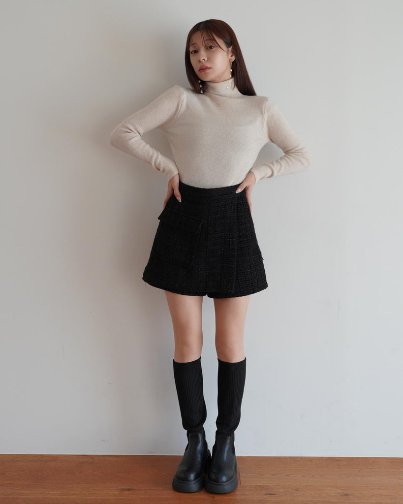 高品質なツイード素材を使ったミニスカート風のショートパンツ。