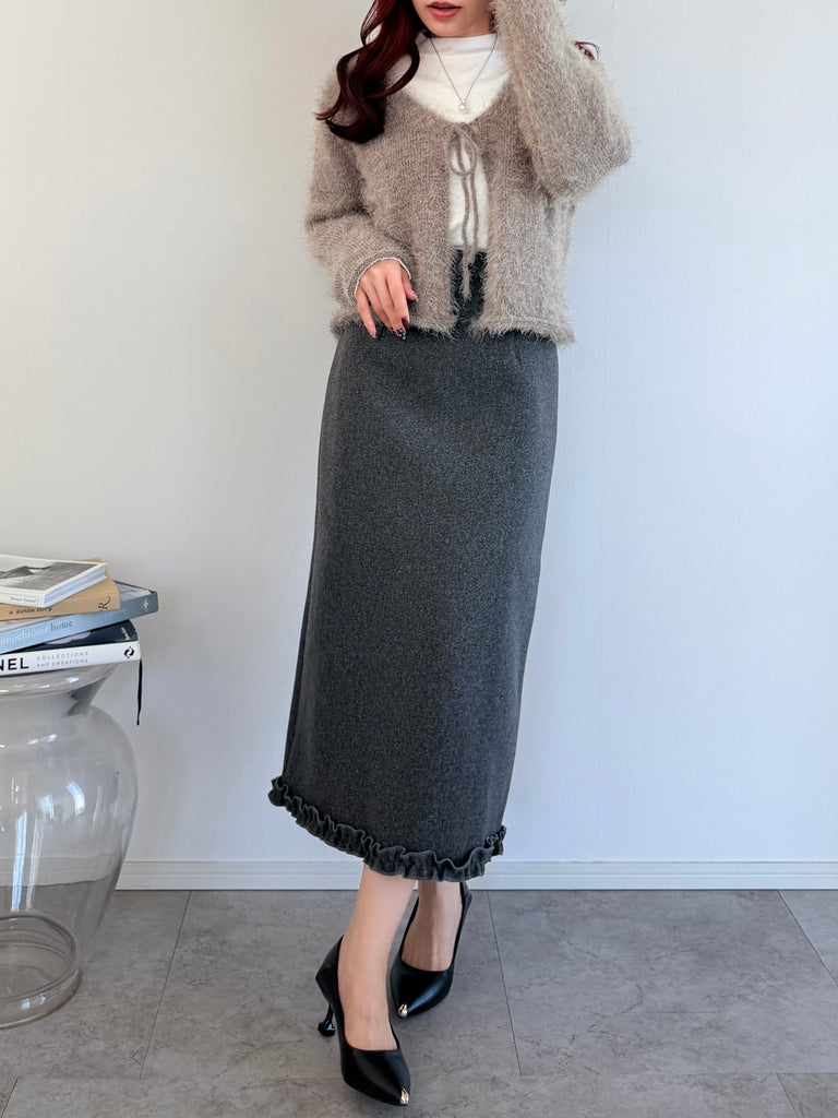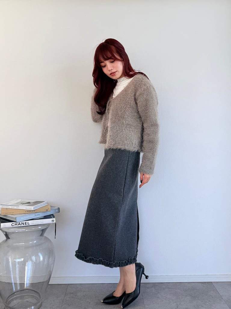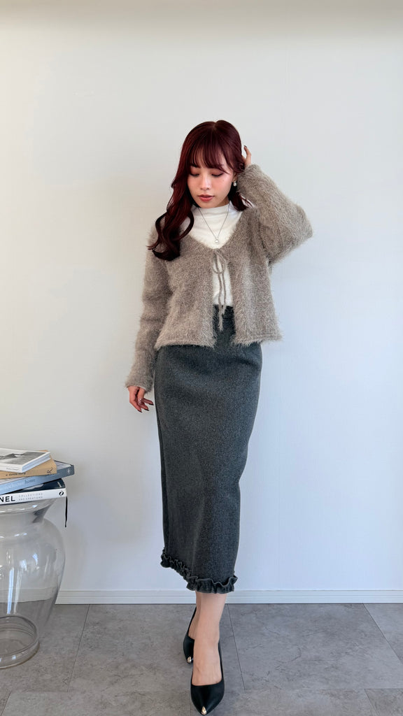 柔らかくて心地よいシャギーニット素材を使用し、ふんわりとした質感が魅力のカーディガン。フロントのリボンデザインが可愛らしいアクセントになり、甘さと上品さを兼ね備えた一枚に仕上げました。